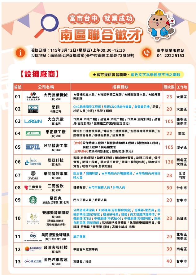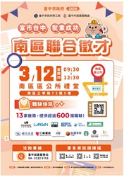 擴大市府徵才活動宣傳2 臺中市政府3月12日上午9:30至12:30,在臺中市南區區公所5樓禮堂舉辦2026「富市台中 就業成功」南區聯合徵才,邀請大光長榮、矽品、三商餐飲、築間餐飲、國光汽車客運等13家廠商徵才,提供600個以上工作機會,洽詢電話04-22225153。