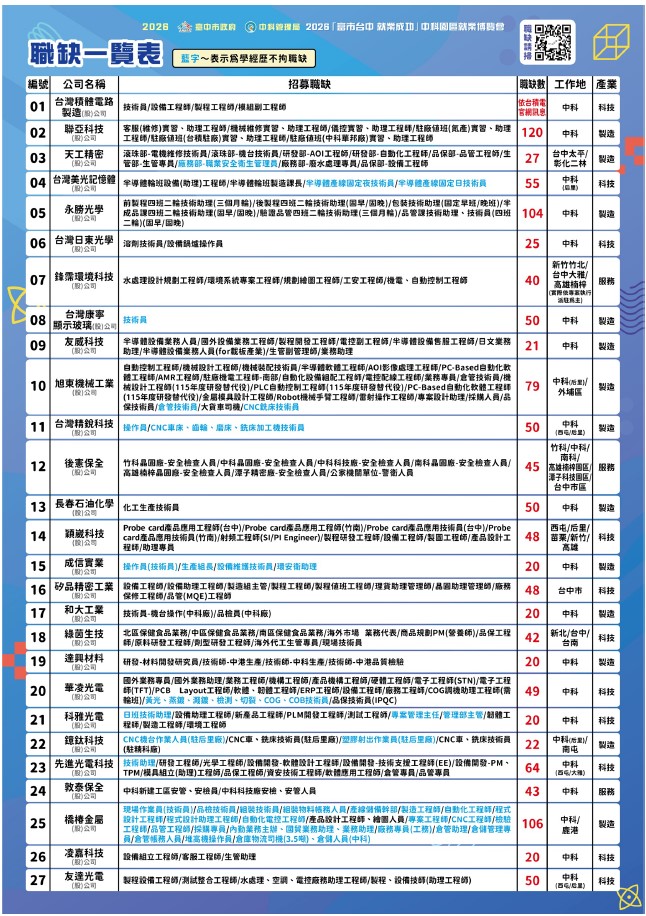 0418中科園區就業博覽會1 2026「富市台中 就業成功」 中科就業博覽會~啟航囉! 時間:4月18日(六) 10:00~14:00 地點:中科管理局1樓(西屯區中科路2號) 邀請27家中科廠商,釋出超過1,200個職缺 有台積電、台灣美光、矽品等多家熱門廠商 誠摯邀請您~踴躍參加,開啟科技薪職涯!